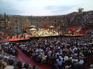 This open air arena rivals the Coliseum in Roma. I took this about 9.30 pm just before dark. The stage area stretches across the “front”, more than 30,000 people can sit here. Tickets are pricey, but the outfits of the well-to-do and the wannabes are fantastic. There is a 60 person orchestra right below the stage at the front. The opera is three hours long — we sit on metal seats covering the ancient stone seating. With 4 intermissions of 20 min each, Carmen ended around 1 am!!