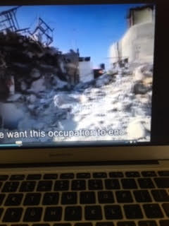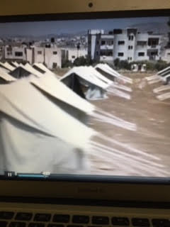 Scenes from the film Jenin, Jenin — a 10 year old girl speaks out, a man with his baby going home to his tent in what’s left of Jenin, the rubble, and the UN tent homes after Israel’s rampage in 2002.