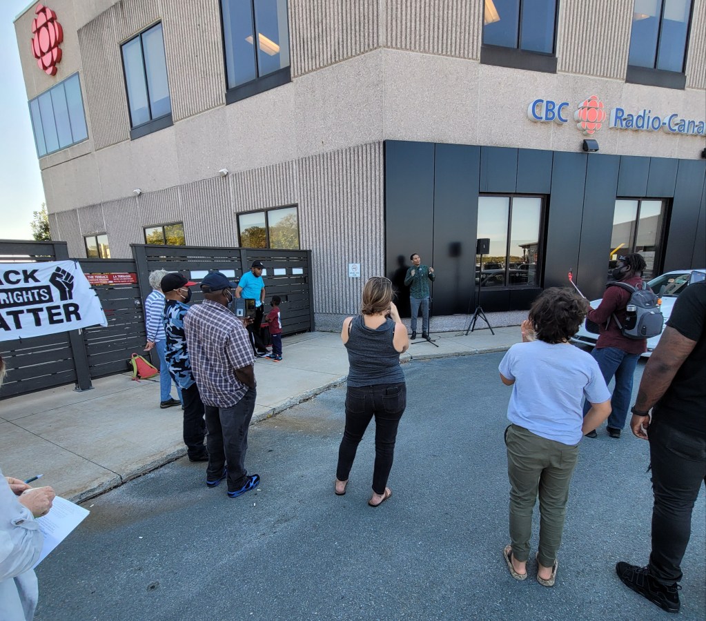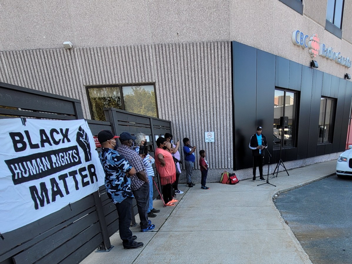 Whatever the case, no media showed up when a group of 20 African-Nova Scotians and a few white supporters set up a sound system, played music and improvised a stage about 10 metres from the CBC’s front door in West End Mall. Raymond Sheppard* organizer of Black Voices Matter emailed nearly 20 members of the Halifax media – radio and TV –a media release earlier in the week which stated that