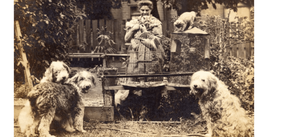 Featured image: Famous Canadian painter Emily Carr with her pets Prince Pumkin, Lady Loo, Young Jimmy, Adolphus the cat, Kitten, Chipmonk, and parrot in her garden at 646 Simcoe St, Victoria BC (1918)