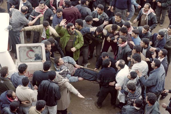 Left: the grave of Baruch Goldstein the American Jewish settler who killed 29 Muslims at prayer (credit Emil Salman) and right: at the Ibrahimi Mosque, friends rescue massacre survivors (credit: Patrick Baz/AFP). In 2019, on the 25th anniversary of the Massacre at the Ibrahimi Mosque, Meretz, a Israeli left-wing party, called for legislation to change Goldstone’s tombstone at Meir Kahane Park that glorifies Goldstein, killer of 29 Muslim worshippers at the Tomb of the Patriarchs in Hebron in 1994.