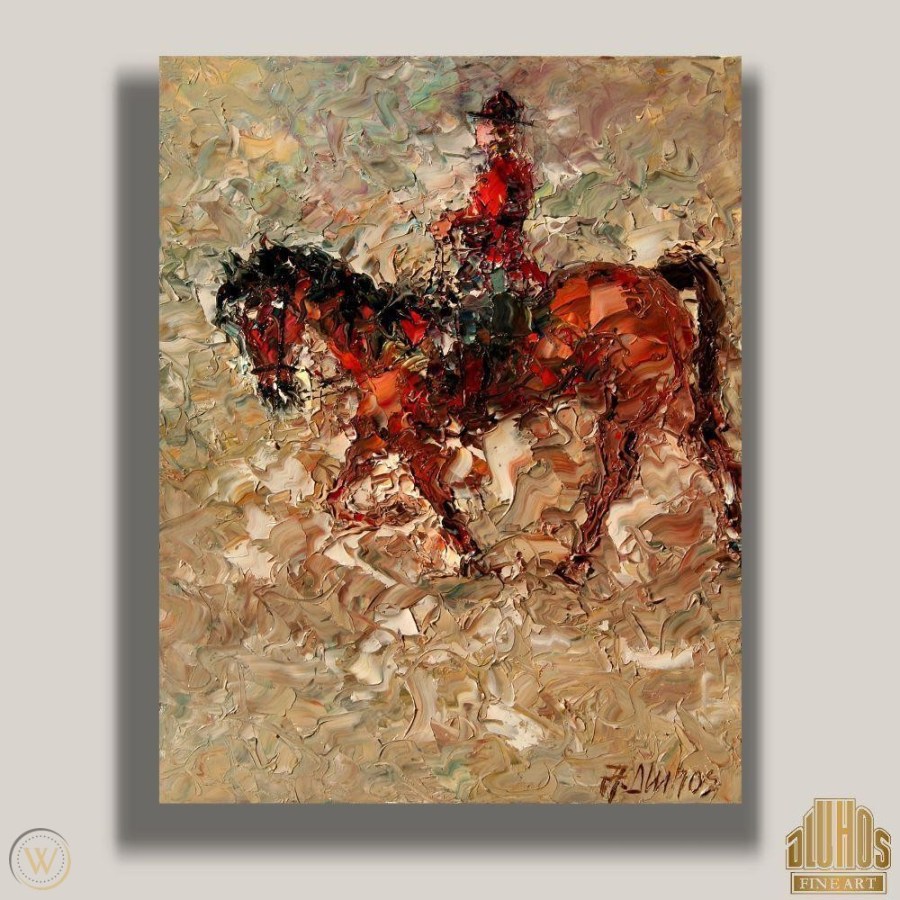 Featured image above: detail from Canadian Royal Mounted Police Horse Rider, by Andre Dluhos. Dluhos was born in 1940 in what is now Slovakia. Now he lives in the US. Here is the oil painting.