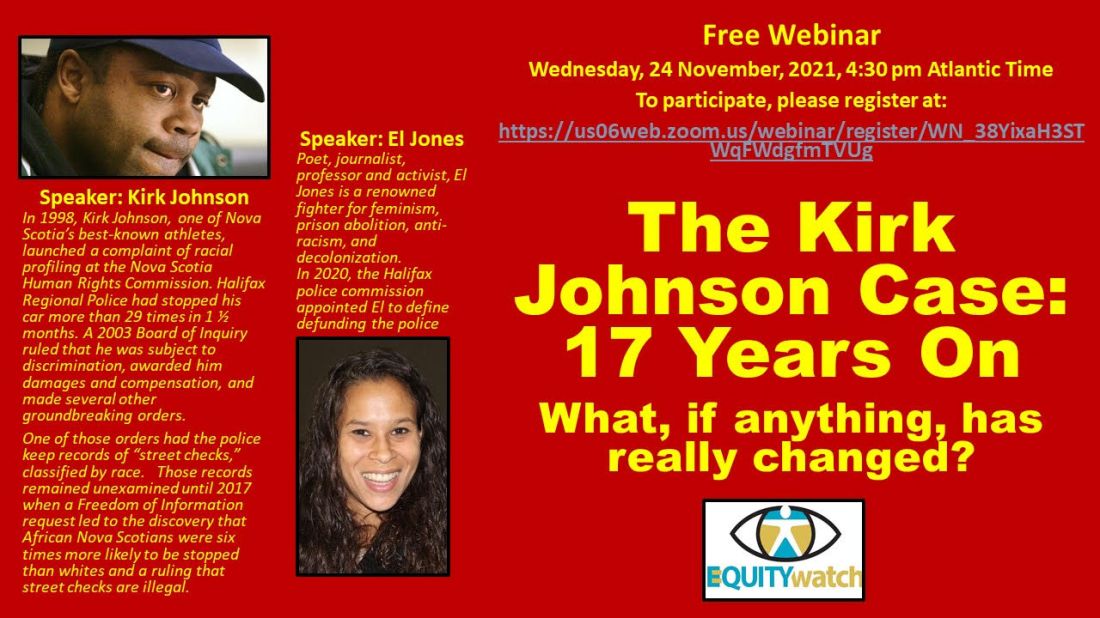 So it’s with great excitement that Equity Watch is bringing the community an interview and discussion with Kirk Johnson — 17 years after his human rights victory. Mt St Vincent University professor and activist El Jones will also speak at the webinar. Please sign up here –and all are welcome! Of course there is no charge.