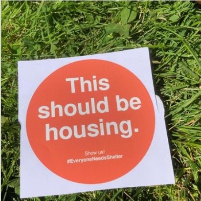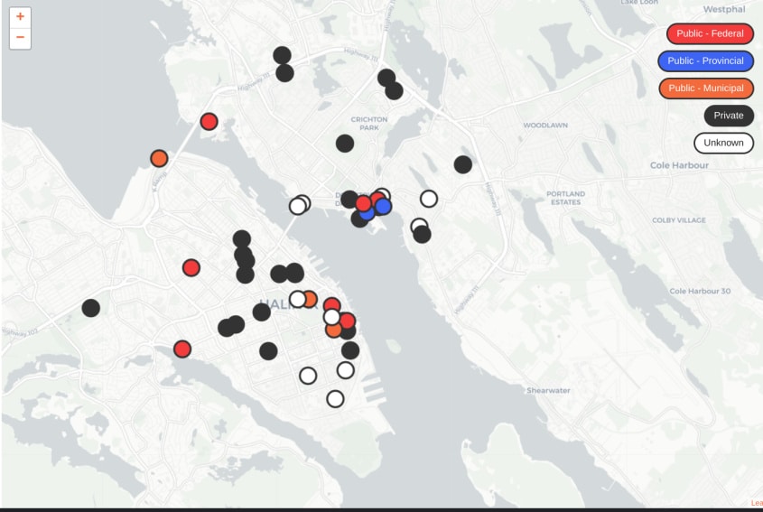 This Should Be Housing: Sticker (NSAdvocate.org); map of where empty buildings and lots that should support housing here (NSAdvocate.org); Vacant 6-storey federal building at 176 Portland St. Dartmouth (Google Street View)