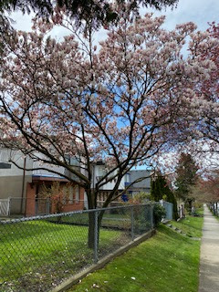 clockwise above: pere et fils in Sushi Nanaimo; pink blossoms on a side street; white blossoms;