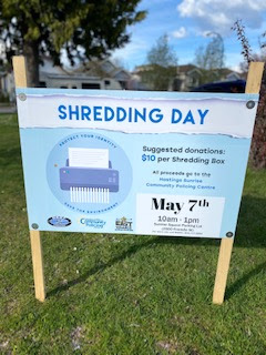 Apparently the community policing budget is so tight, they offer a shredding service nearby; a typical stairway of a two storey building on East Hastings St; looks like a wild rose tree; pop-up-plaza, one of six on Vancouver streets, closed to traffic but a nice place to sit, eat and watch people. This one is at Kamloops and East Hastings.