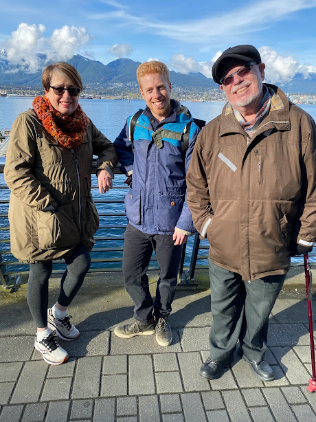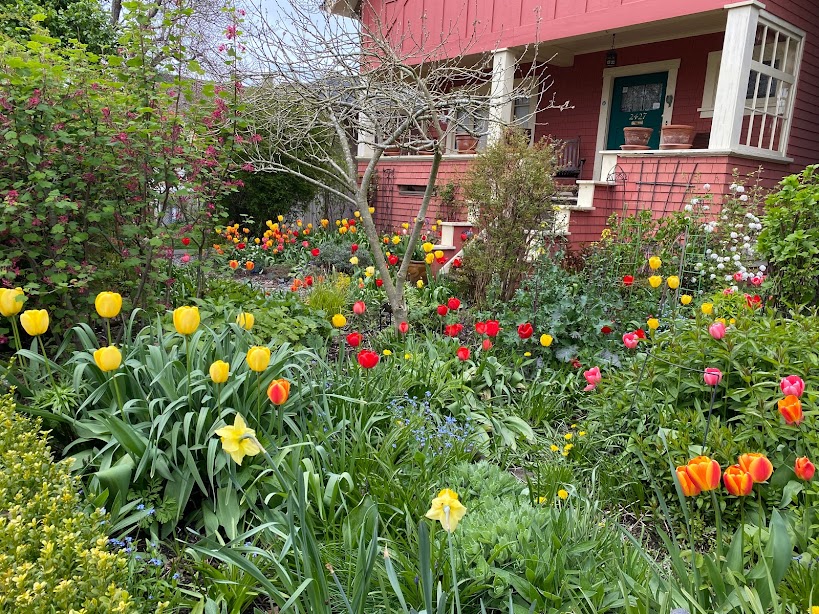 Clockwise: tulip festival, front yard in Sunrise area of Vancouver; pink blossoms on our street; rooftops from our kitchen window; photo of Larry and MP, a local activist; we three on the waterfront looking to the North Shore.