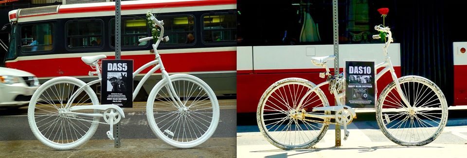 From Left: Michael Bryant, Ontario’s former Attorney-General, while driving his Saab convertible on a main street in Toronto, hit and killed Darcy Allan Sheppard who was a bike courier. Bryant is seen in this photo walking with his wife, Susan Abramovitch, who was a passenger in the car at the time. Since that time, they’ve divorced (thestar.com). Bryant was charged with criminal negligence causing death and dangerous operation of a motor vehicle. But the charges were dropped. Portrait of Darcy Allan Sheppard, aged 33 when he died, and the “ghost” bicycle tribute set up by his friends and other couriers. (The Darcy Allan Sheppard Files, at Darcyallansheppard.wordpress.com)