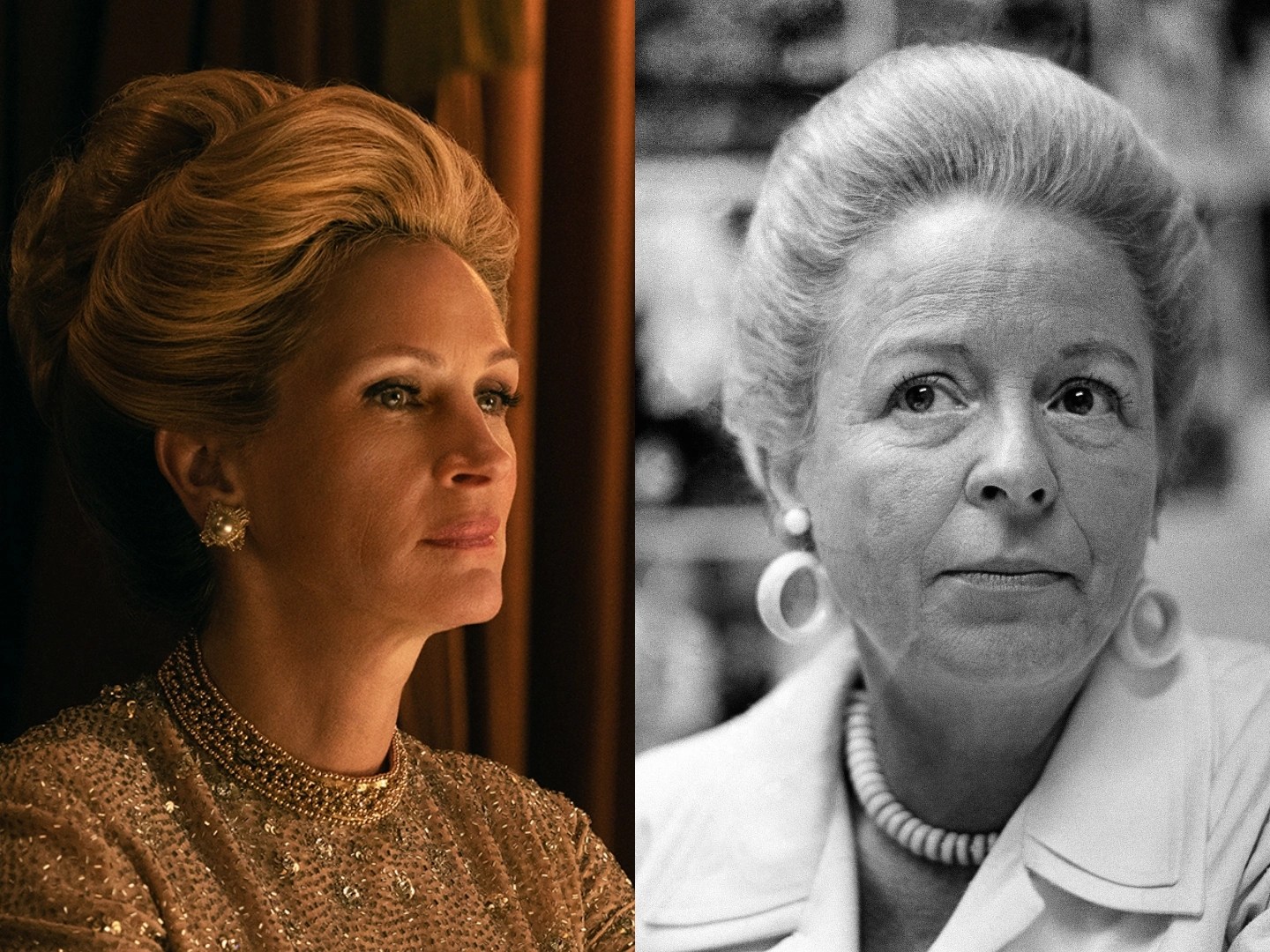 Top left, clockwise: lawyer Mickey Haller and chauffeur Izzy in The Lincoln Lawyer; the key prosecutor in Two Summers (thecinemaholic.com); portraits of the real Martha Mitchell and Julia Roberts portraying her in the film Gaslit; images of the gang who go on holiday in Two Summers (Variety.com and cinemaexpress.com)