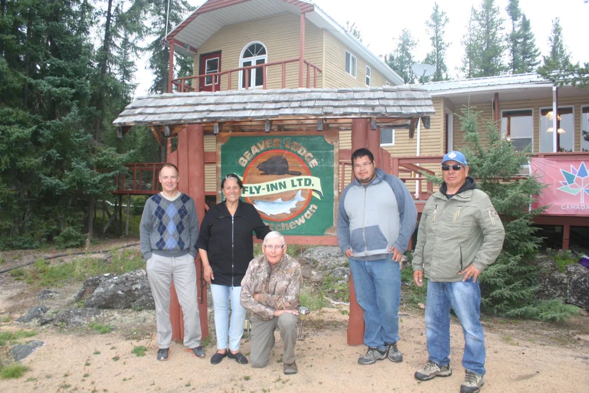 From left, clockwise: first search party for Middle Foster Lake in 2018. From Left: Michael Nest, Deanna Reder, Eric Bell, Thompson Mckenzie and Stanley Roberts. Mckenzie and Robertson from Grandmother’s Bay Indian Reserve operated their community’s sonar equipment to search the lake bottom. (credit Deanna Reder); Absolom Halkett is closest to the camera in this 1966 photo from a tree planting ceremony at the hospital in La Ronge (courtesy of Don Neely); photo of Jim Brady in uniform during WWII (Saskculture.ca); painting by artist Donna Langhorne, of Air Ronge.