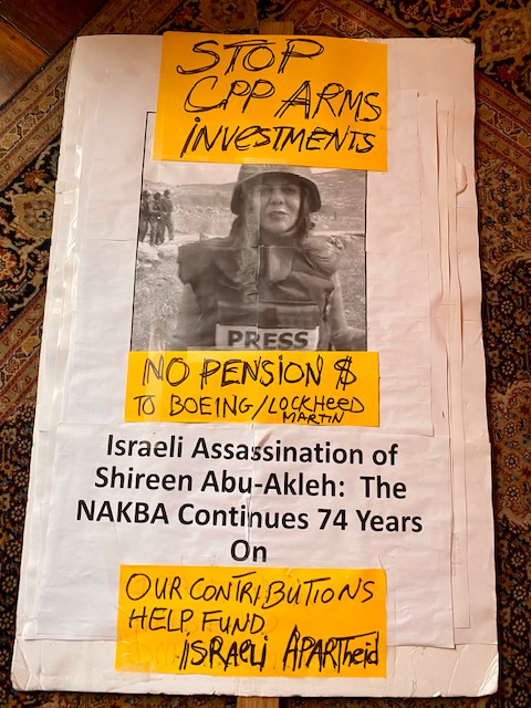 I was at the entrance to the Public Gardens, waiting for my friend. I was holding a sign that said “Stop CPP Arms Investments; No Pension $ to Boeing & Lockheed Martin.” [It showed a picture of the Palestinian journalist Shireen Abu-Akleh who was assassinated by Israeli snipers May 11, 2022] and “Our Contributions Help Fund Israeli Apartheid.” As you can see, there was not one word on the sign about Ukraine, or Russia. These boys were out to pick a fight.