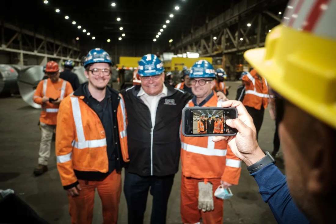 Above from Ontariopc.ca and below: employees at Stelco in Hamilton, Ont. get a photo taken with Doug Ford just before the Ontario election in June (credit Joshua Best/The Globe and Mail)