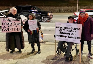Nine days ago, a small group protested outside the Scotiabank Centre just before Team Canada vs Austria game. We were protesting the rape culture alive and well, and largely ignored by Hockey Canada, by the police, or consistant attention from the media. We leafleted some of the 10,000 fans who lined up with their tickets to the game. Half the ticket holders offered the flyers refused to take a leaflet, half did. Three quarters were men; some brought their wives or girlfriends, and some brought their pre-teen children. Some of the children asked their parents, “What’s gang rape?”