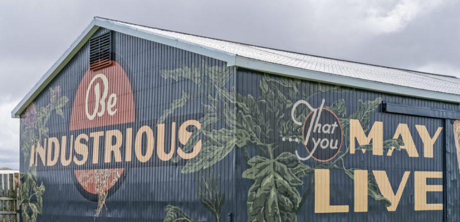 Featured Image above: A closer view of Ericka Walker’s mural at Longspell Point Farm in Nova Scotia, part of an exhibit of art called Uncommon Common Art. Photo: Ernest Cadegan.