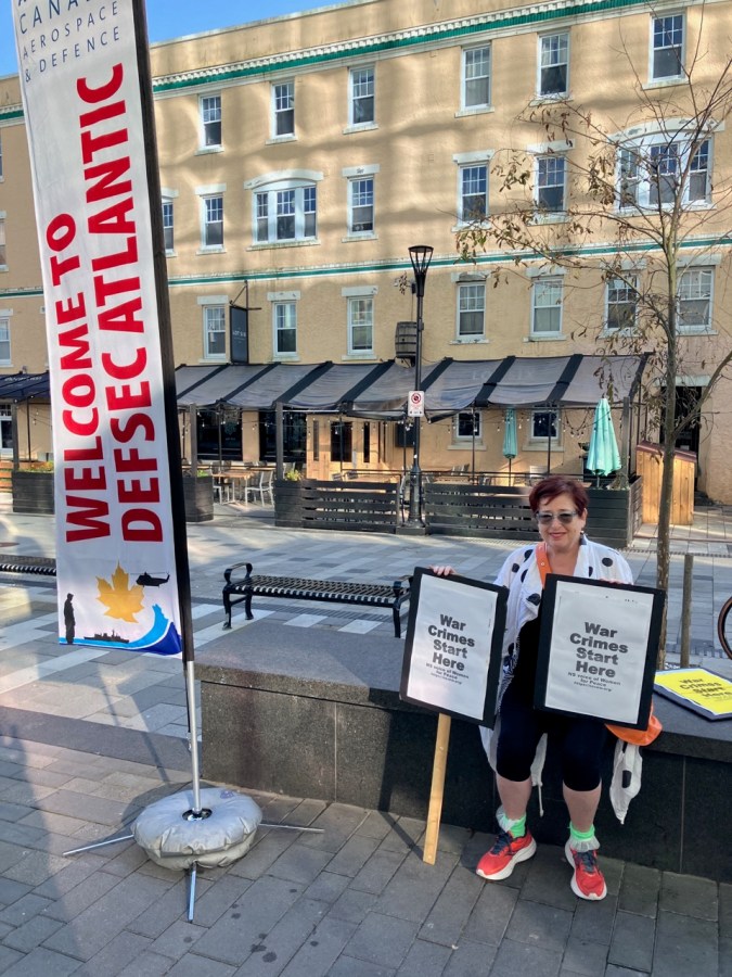 By then the security guard was weaving a path my way, so I went outside with my two co-protester friends. We leafleted outside on the Convention Centre steps. Our signs read War Crimes Start Here. It is a riff on the 2011 NS government slogan “Ships Start Here”. At the time, NS spent more than $1.4 million in advertising to tout that Irving Shipyard had won a $25 billion 30-year federal contract to build combat ships.