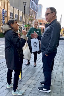 A funny thing about the DefSec Convention. From what I could see, attendees were about 90% male. But also entering the centre at 9 am were many women. Turns out the women were doctors or nurses attending the International Symposium on Paediatric Pain. Not only did most of the women stop, listen to us, and take a leaflet but quite a few thanked us for our protest!