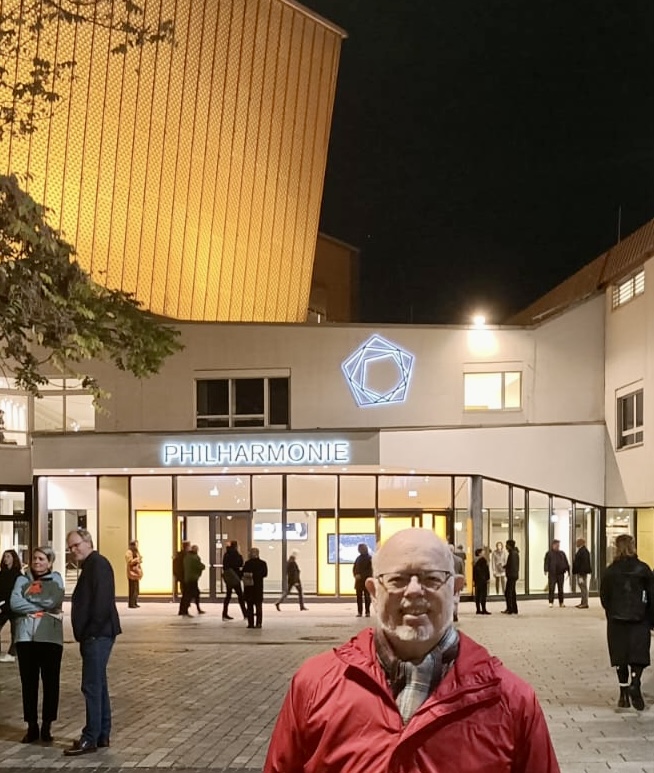 Below: skateboarding sign for seniors; street art from before Oct. 7; and Larry at the Philharmonie to hear an Icelandic pianist play the Goldberg Variations. He says it was wonderful.