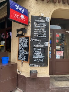 At shops, and thru windows… graffiti is everywhere. Left, through the window of Einstein’s cafe (a chain in Berlin) where there is no internet, and no laptops are allowed. Einstein’s coffee is not great either. Centre is the Fluffy Shop with the Japaneses ‘hello’ cats, and a bar near me.