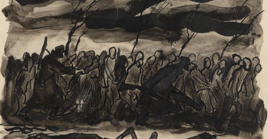 Featured artwork above: Death March (Czechowice-Beilsko, January 1945) by Jan Hartman (1926-2009). The gouache (pastels) on paper drawing from 1945 hangs at the Imperial War Museum, London, UK. For more about the artist, read this.
