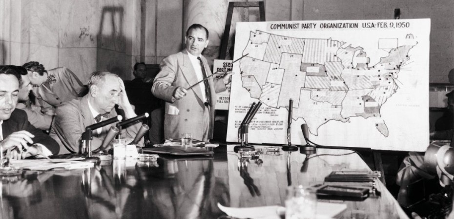 Photo at the top: from 1954: Senator Joseph McCarthy points to a map depicting Communist Party organization across the US. Army counsel Joseph Welch and others are seated. Welch held his head with his left hand in frustration after he just denounced McCarthy as a “cruelly reckless character assassin.” (Bettmann/Getty Images)