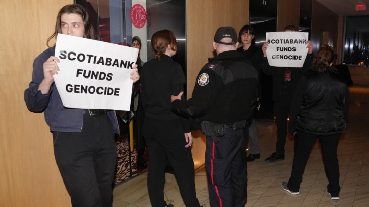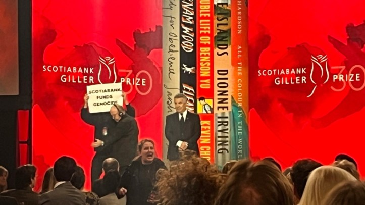 Protesters also disrupted Canada’s prestigious Giller Prize Gala in Toronto last November, a literary award sponsored by Scotiabank. Some protesters jumped onstage with signs that read “Scotiabank funds genocide”. Gala host Rick Mercer attempted to rip one of the signs from a protester’s hands.