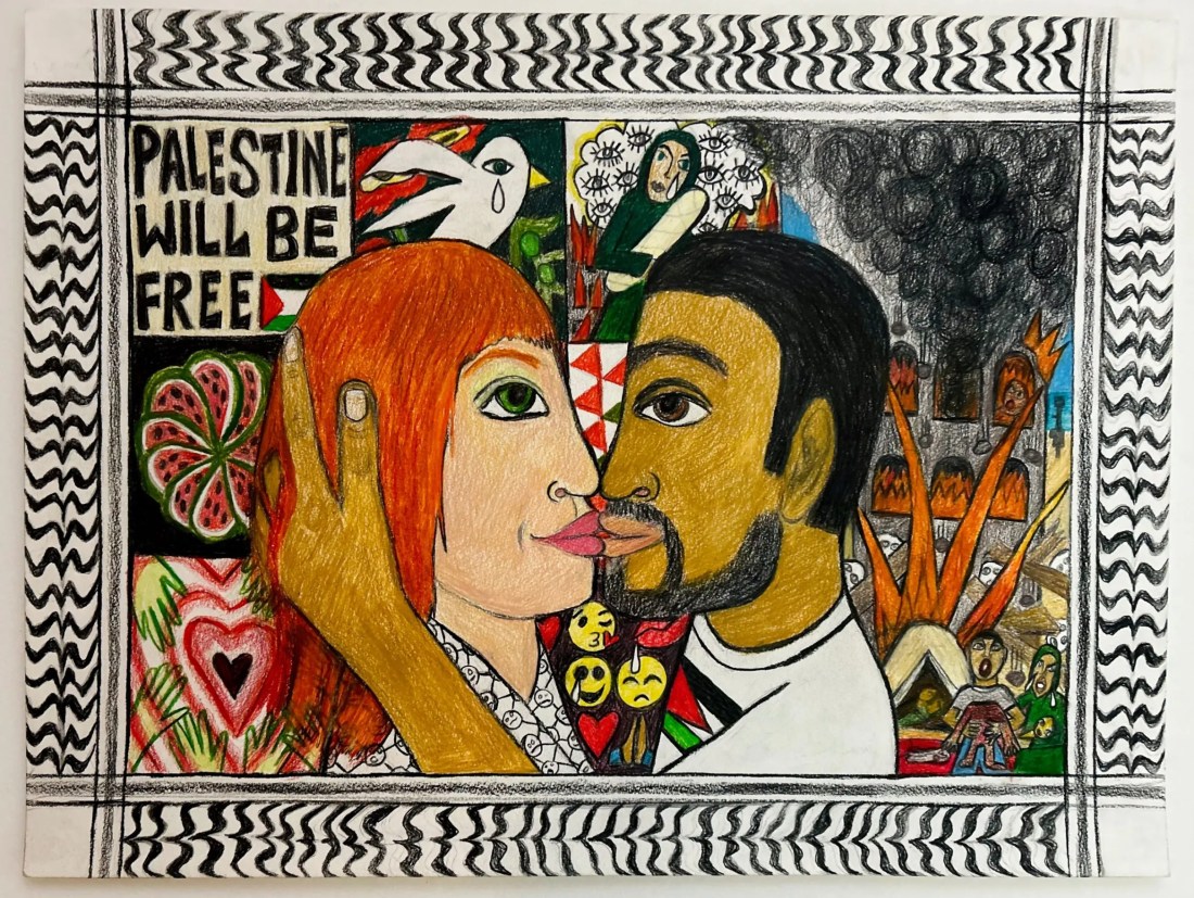 Left: Activists and artists unfurled a massive quilt for Palestine on the front steps of New York’s Metropolitan Museum of Art on March 23, 2024 (photo Maya Pontone/Hyperallergic) Right: Goyette, “To Resist is to Love/There is Love in Resistance” (2024), watercolor pencil on paper, 18 x 24 inches (courtesy the artist).