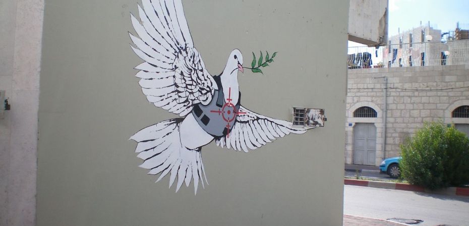 Painting at the top: Banksy’s “Armored Dove of Peace” (2007), accessed via Wikimedia Commons. Banksy is a British artist and graffitier.