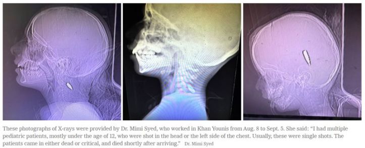 The New York Times reports that 44 out of 65 American doctors who have volunteered recently in Gaza’s almost destroyed hospitals, have seen children brought in with one bullet lodged in their brain or left side of their chest, right where doctors place their stethoscopes.