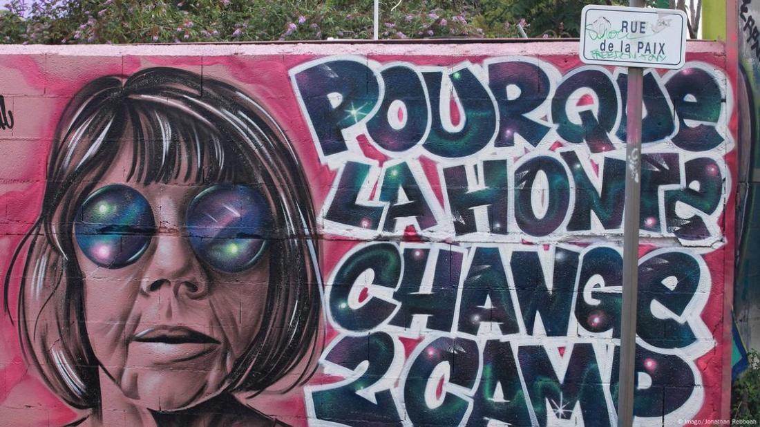 Below left, ‘Shame must change sides’ has become a motto for feminist women. (Credit: Jonathan Ribboah, DW) Mohamad Salaheldin Abdelg Alsayed/Anadolu/picture alliance). Right: a photo of Ms Pelicot (Credit: Christophe Simon/AFP).