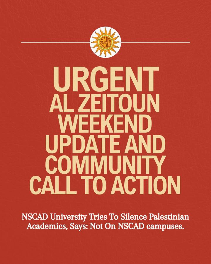For weeks NSCAD students and their student union, SUNSCAD, have been planning an information and action two-day event in support of Palestinian rights. The Al Zeitoun Weekend is named after the Al Zeitoun tent encampment at Dalhousie University which stood in solidarity with Palestinians in Gaza from May to August 2024. The Al Zeitoun encampment joined more than a dozen other encampments at universities across Canada that opposed Israel’s genocide in Gaza. Tenters and supporters demanded their institution divest from investments and programs that support Israel, and called for a ceasefire.