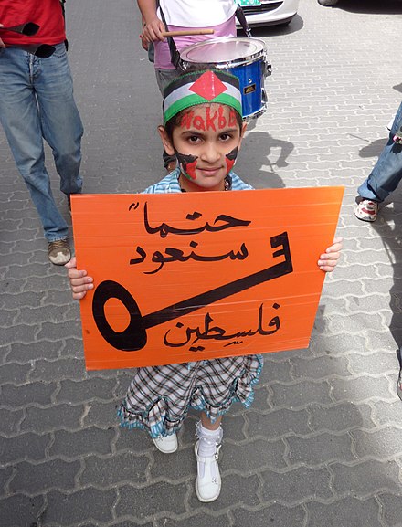 Young Palestinian girl with a key symbol, at Nakba Day, 2010, in Hebron in the West Bank. The sign says: Arabic: حتماً سنعود فلسطين, romanized: We will return to Palestine. (From Wikicommons).