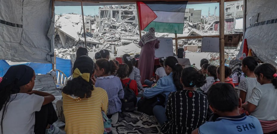 Photo at the top: Palestinian teacher Israa Abu Mustafa took the initiative to set up a classroom in a tent on the ruins of her destroyed home with the aim of teaching children as the new school year began, Sept. 12, 2024. (credit: Saher Alghorra—ZUMA Press)