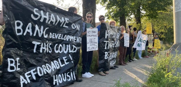 About a dozen people showed up for a demonstration in front of the Bloomfield school site in Halifax on 8 Sept. 2023. (photo credit: Suzanne Rent, Halifax Examiner). Rent’s story that accompanies the picture is here.