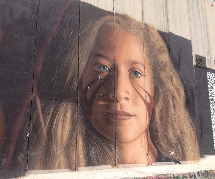 Below: Ahed Tamimi painted on the “separation wall at Bethlehem: artist Jorit Agoch from Italy, and several others; logo for Al Jazeera; Temple Mount and Dome of the Rock, Jerusalem; Muhammad and father Jamal Durrah, seconds before Muhammad was shot to death by IDF; photo of the late journalist Shireen Abu Akleh.