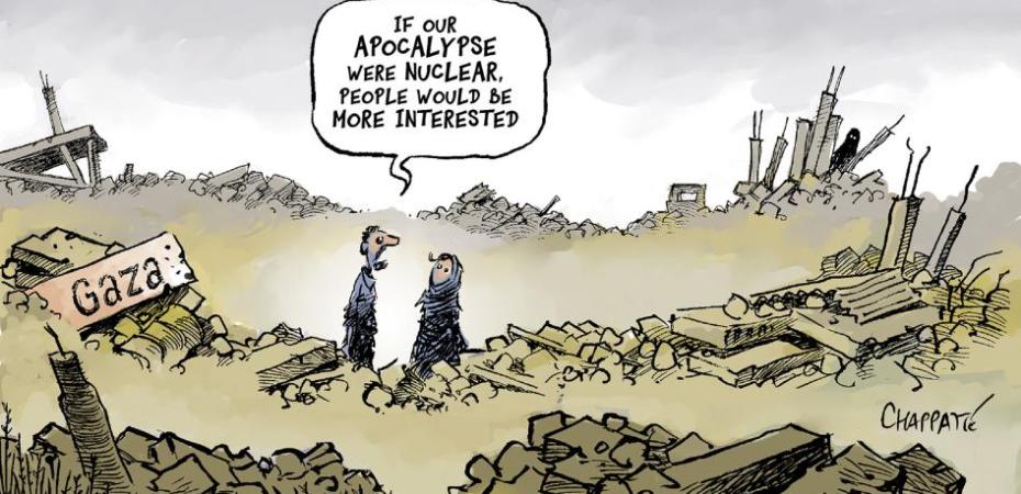 Illustration at the top: “As seen from Gaza” by Swiss-based cartoonist Patrick Chappatte