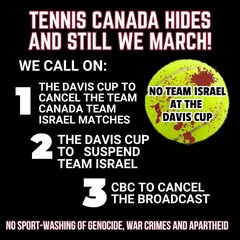 Tennis Canada (TC) had sponsored the qualifiers’ tournament for the Davis Cup: Team Canada vs Team Israel. What was meant to be a great celebration and love-in for Israel crumbled as the Halifax-Dartmouth activist community pressure and campaign “No Love for Genocide” pressured Tennis Canada to back down.