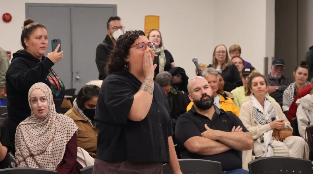 Below: left– as Mayor Fillmore shut town the town hall; two photos of anti-genocide protesters a the town hall
