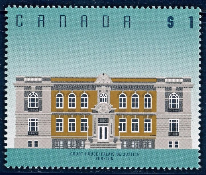 Photo at the Top: Yorkton, Saskatchewan 1912. The courthouse in Yorkton was where the bail hearings for the Quewezance women took place. Below, stamp to commemorate the courthouse architecture.