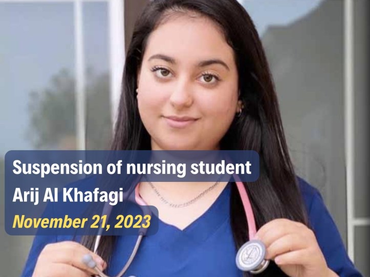 - Halfway through her final year of nursing school, the University of Manitoba (U of M) suspended Arij Al Khafagi. The administration also placed a five-year reprimand on her academic transcript. The university said it acted on two anonymous complaints that Al Khafagi’s social media posts were antisemitic. According to a U of M history professor (who is Jewish) and supported her,